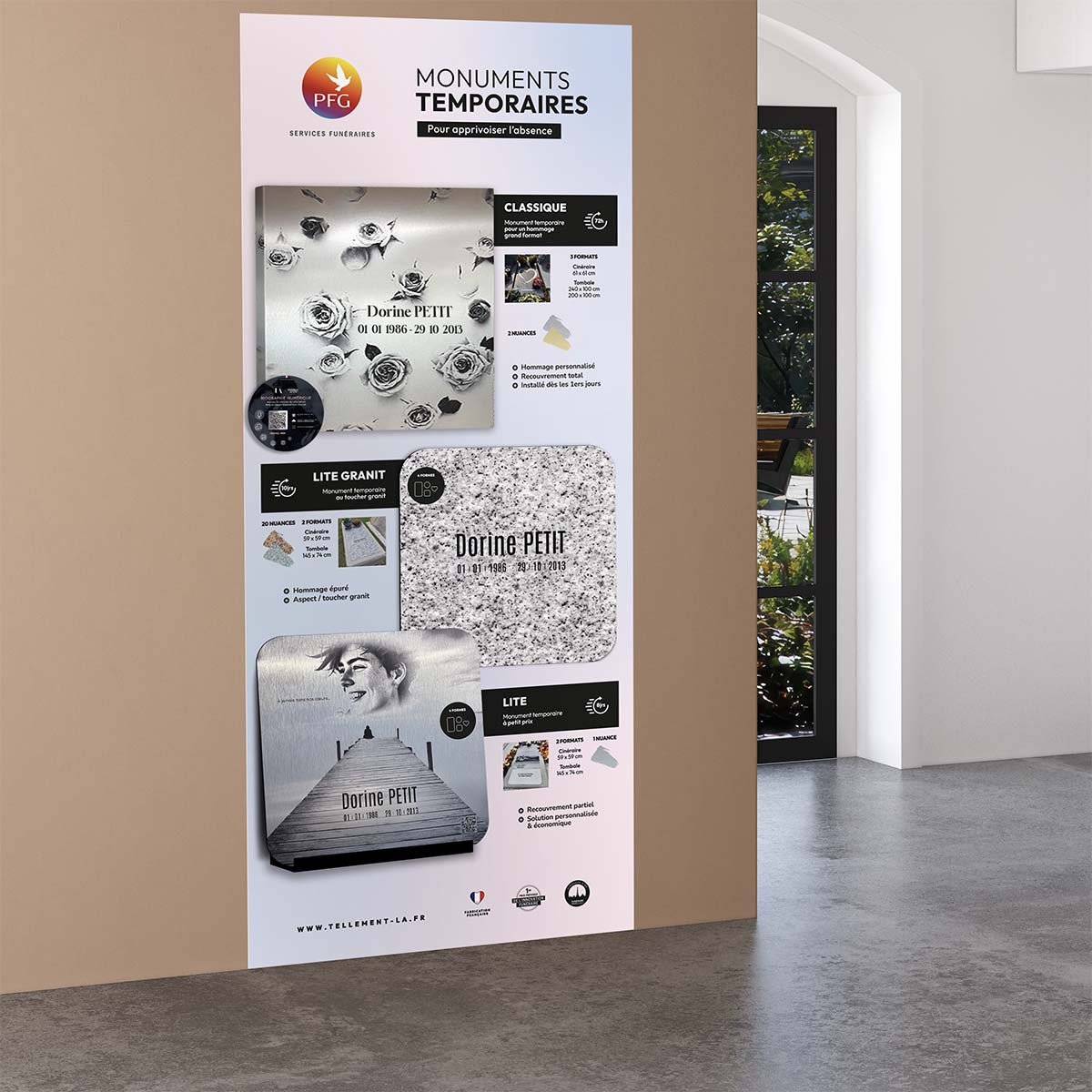 Effet granit et toucher texturé pour un monument temporaire sobre avec textes personnalisables